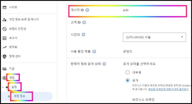 계정 → 설정 → 계정 정보로 들어가셔서 → 게시자 ID에 pub 코드 확인 가능합니다.