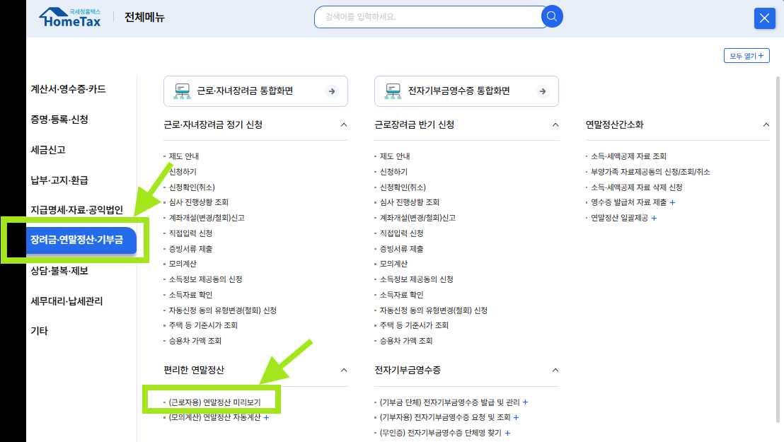 홈택스 로그인 후 [연말정산 미리 보기] 메뉴로 이동합니다. 작년 신고 내역을 불러온 뒤, 올해 예상 총급여액을 입력해 최신화합니다.